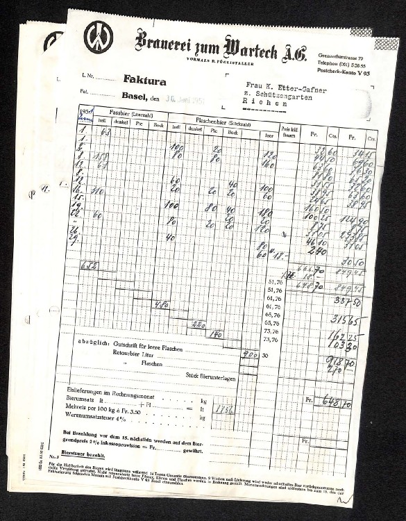 Zusatz: Monatsrechnungen 1951 Kategorie: Dokumente Unterkategorie: Lieferscheine/Quittungen/Rechnungen Anzahl Exemplare in Sammlung: 1 Datierung: 1951 Hersteller: Material: Papier Masse: Masse Zusatz: Beschreibung: Diverse Monatsrechnungen aus dem Jahre 1951 für K. Etter, Schützengarten, Riehen. Sprache: DEU Sammlung: Verein Warteck Museum Wert: 5 Inventar-Nr: 110151130 Hinweise/Korrekturen/Ergänzungen zu diesem Gegenstand: » Sende ein Mail |
