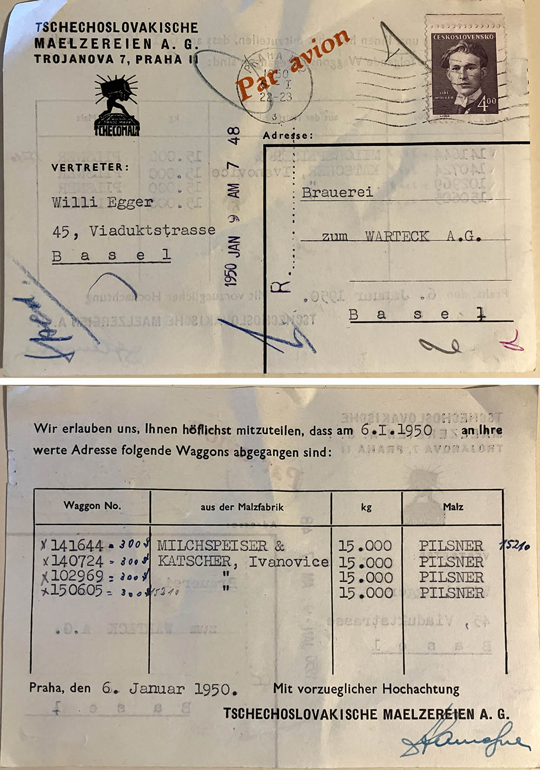 Zusatz: Tschech. Mälzerei Kategorie: Dokumente Unterkategorie: Diverse Dokumente Anzahl Exemplare in Sammlung: 1 Datierung: 1950 Hersteller: Material: Papier Masse: Masse Zusatz: Beschreibung: Avisierung der Tschechischen Mälzerei in Prag an die Brauerei Warteck, dass 4 Waggons Malz losgeschickt wurden. Sprache: DEU Sammlung: Verein Warteck Museum Wert: 50 Inventar-Nr: 111101100 Hinweise/Korrekturen/Ergänzungen zu diesem Gegenstand: » Sende ein Mail |