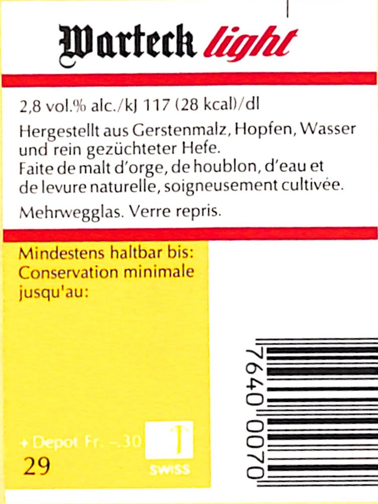 Zusatz: Rücken-Etikette Kategorie: Etiketten Unterkategorie: Light Anzahl Exemplare in Sammlung: 2 Datierung: Hersteller: Material: Papier Masse: Masse Zusatz: Beschreibung: Rückenetikette 29cl. Warteck Light. Mit Strichcode. Sprache: DEU FRA Sammlung: Verein Warteck Museum Wert: 5 CHF Inventar-Nr: 21720203 Hinweise/Korrekturen/Ergänzungen zu diesem Gegenstand: » Sende ein Mail |