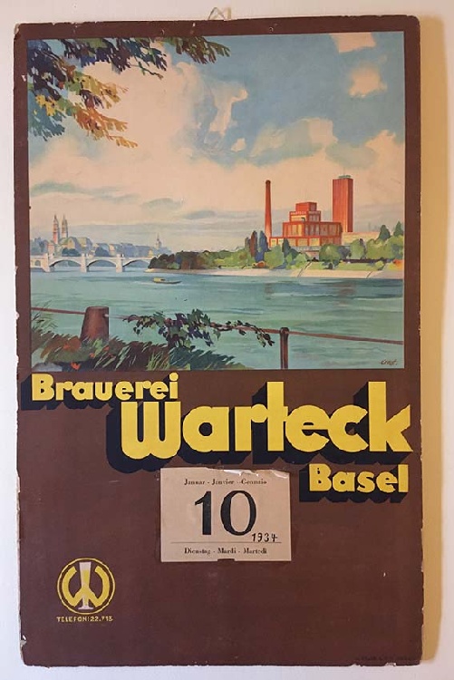 Zusatz: Abreisskalender Kategorie: Kalender Unterkategorie: Abreisskalender Anzahl Exemplare in Sammlung: 1 Datierung: 1934 Hersteller: A. Trüb & Cie, Aarau Material: Karton Masse: Höhe: 520mm Breite: 325mm Masse Zusatz: Tel: 3.38.55 Beschreibung: Brauerei WARTECK Basel Jahreskalender 1934 Signiert: Ernst. Sprache: Sammlung: Verein Warteck Museum Wert: 100 CHF Inventar-Nr: 260119340 Hinweise/Korrekturen/Ergänzungen zu diesem Gegenstand: » Sende ein Mail |