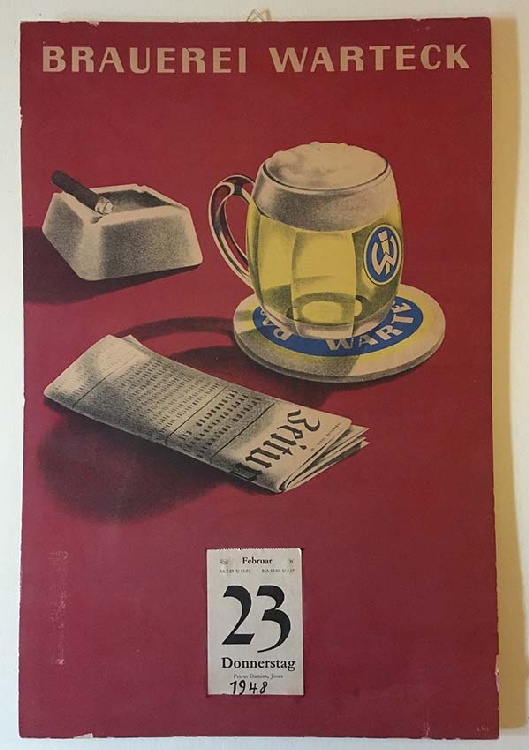 Zusatz: Abreisskalender Kategorie: Kalender Unterkategorie: Abreisskalender Anzahl Exemplare in Sammlung: 1 Datierung: 1948 Hersteller: a.his Material: Karton Masse: Höhe: 485mm Breite: 320mm Masse Zusatz: Beschreibung: BRAUEREI WARTECK Jahreskaldender 1948 Sprache: DEU Sammlung: Verein Warteck Museum Wert: 75 CHF Inventar-Nr: 260119480 Hinweise/Korrekturen/Ergänzungen zu diesem Gegenstand: » Sende ein Mail |